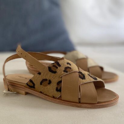 Sandalia cuatro tiras en cuero flor suela y cabretilla de pelo animal print.