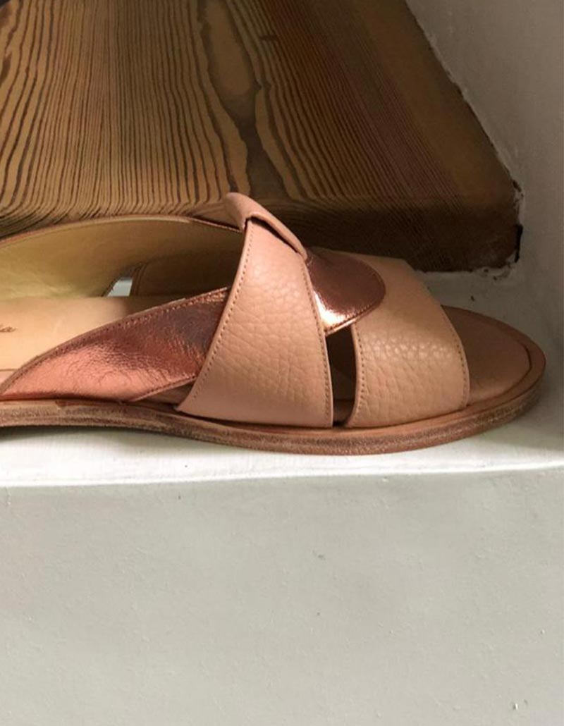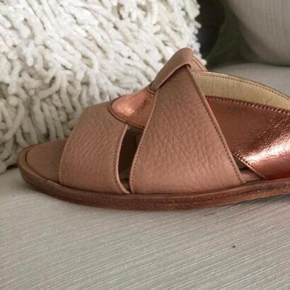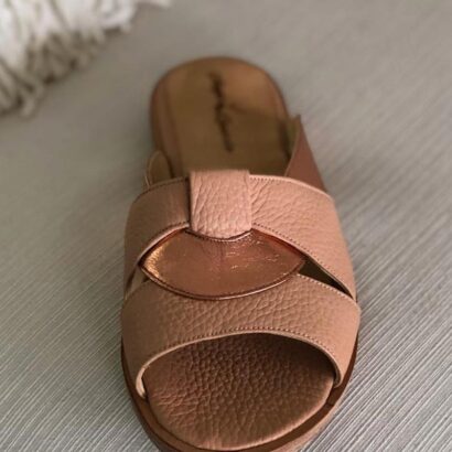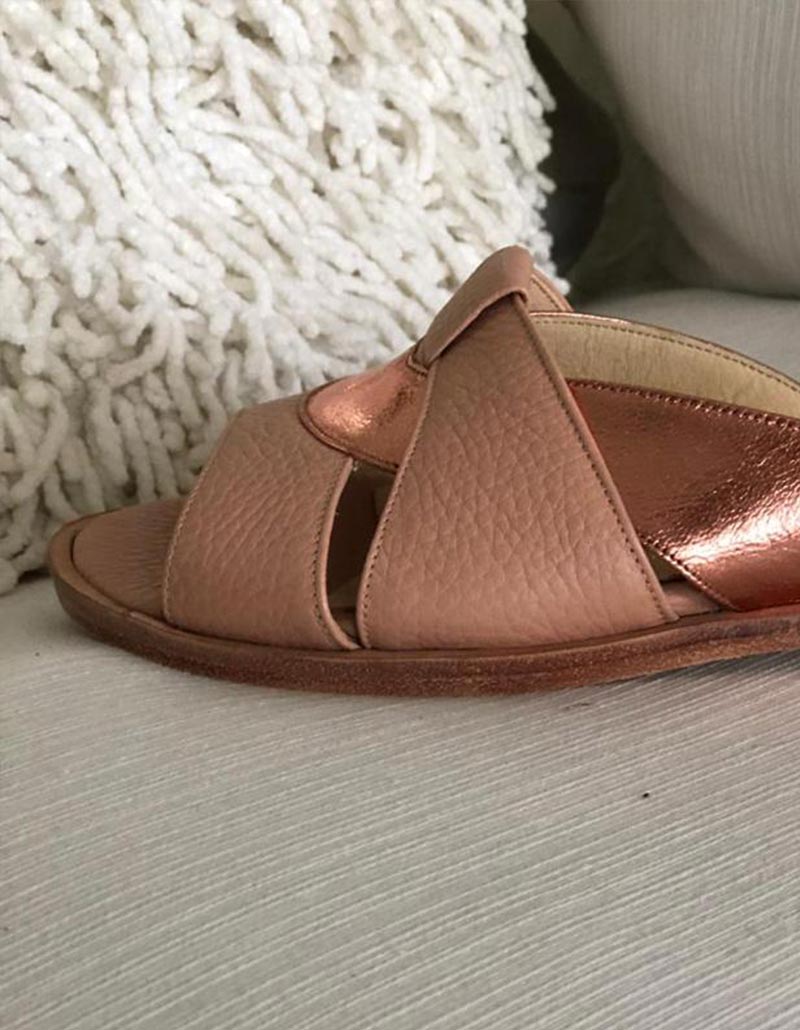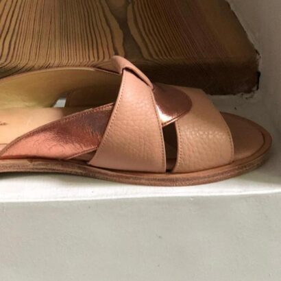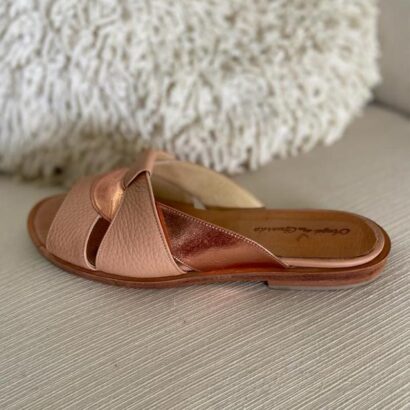 Chancla bicolor cuero floater rosa y cabretilla metalizada cobre.