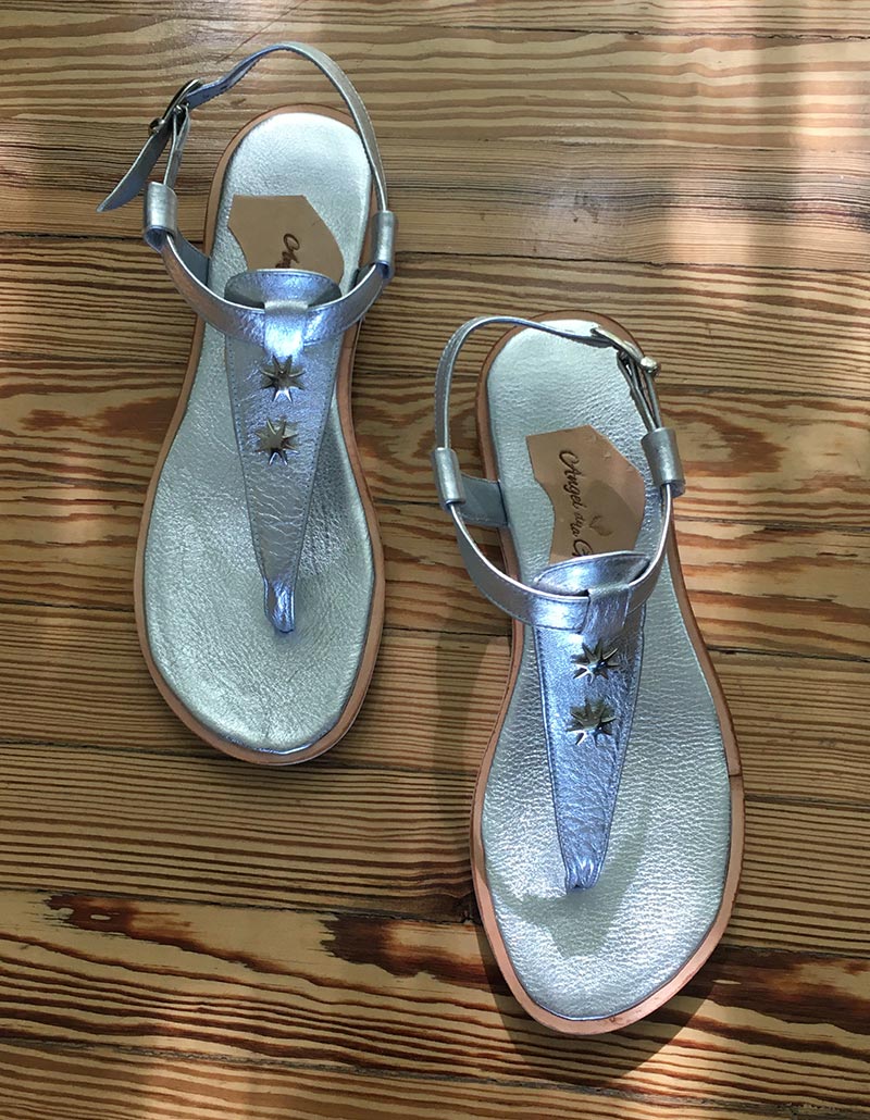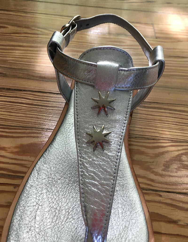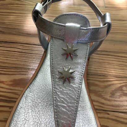 Ojota en cuero transfer plata metalizada.