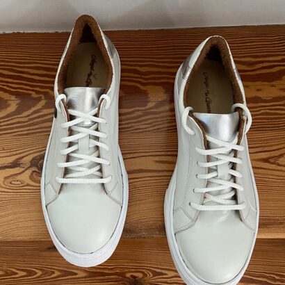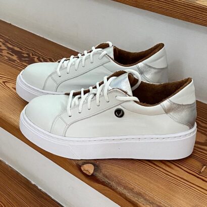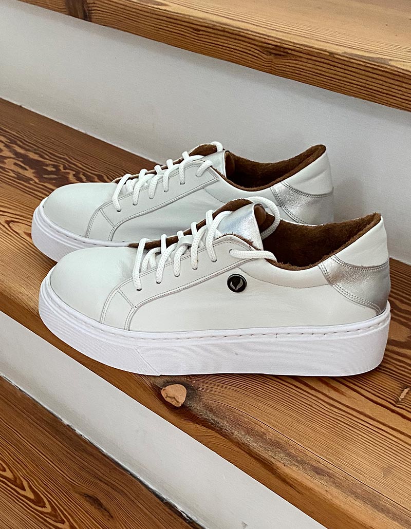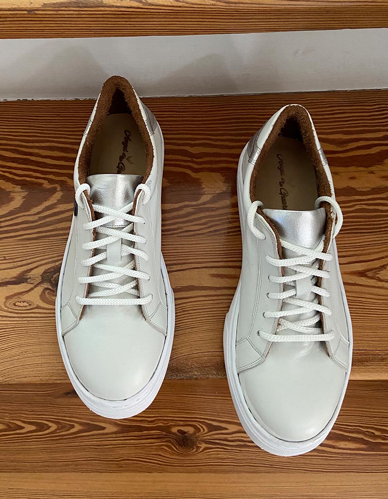 Zapatilla cuero floater blanco con detalle de media lengüeta y logo en transfer plata metalizado.