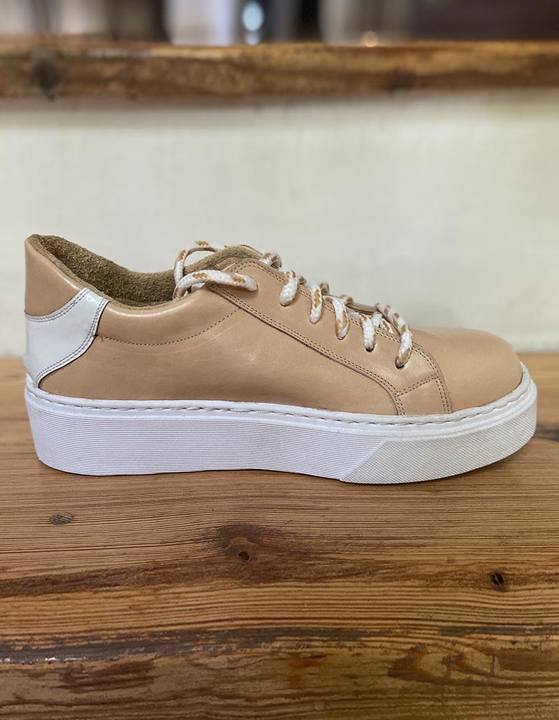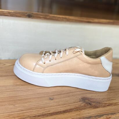 Zapatilla cuero flor nude con detalle de media lengüeta y logo en cuero floater blanco.